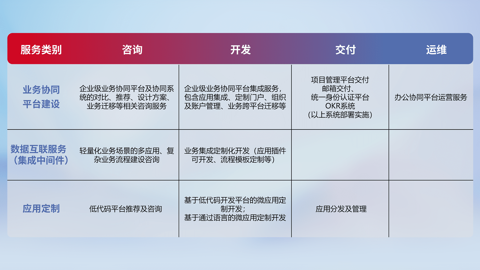 针对钉钉、、、、企微、、IDaas等平台级产品提供产品的规划、、、、方案、、、交付、、、定制化开发等服务,,实现如统一协同办公、、、智能客户服务、、混合会议管理、、、智能数据查询、、、等业务场景,,,,实现数字化转型。。。