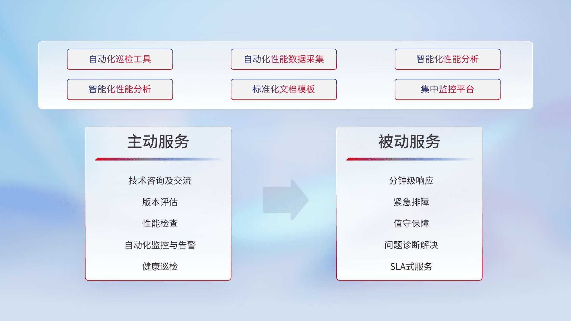 智能化工具和标准化文档,,,保障服务质量,,,,提供主动服务(包含技术咨询、、版本评估、、、性能检查、、、、自动化监控与告警、、健康巡检)和被动服务包含(分钟级响应、、、紧急排障、、值守保障、、、问题诊断解决、、、SLA服务)。。